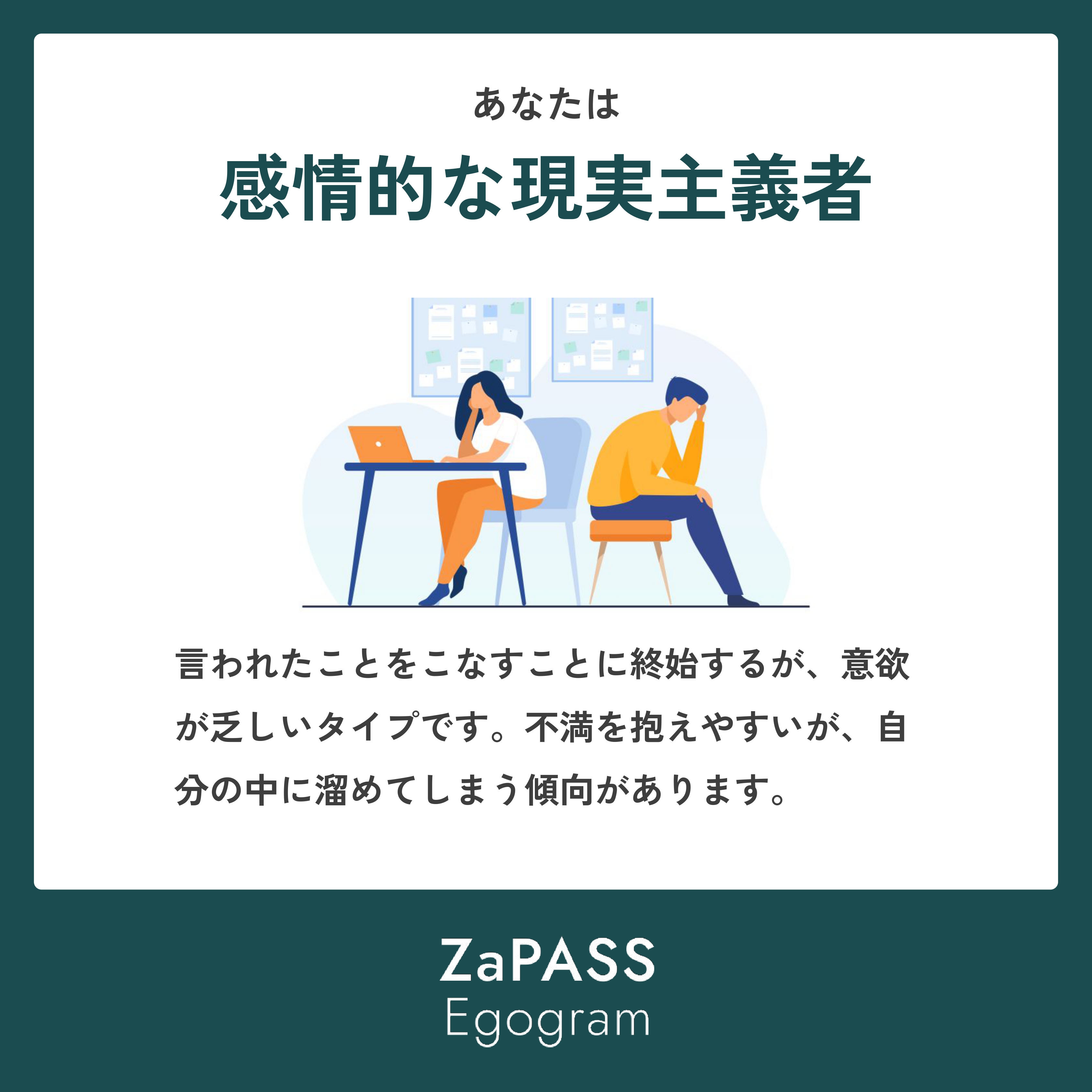 言われたことをこなすことに終始するが、意欲が乏しいタイプです。不満を抱えやすいが、自分の中に溜めてしまう傾向があります。